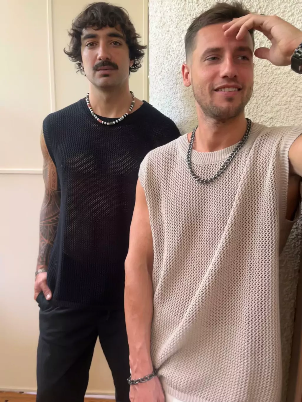 Chaleco tejido 100% de algodón con puños en las terminaciones. Disponible en negro o beige y en talle 1 (S/M) y talle 2 (L/XL)